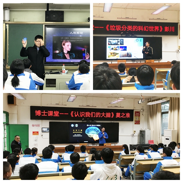 会议期间,3场博士课堂科普课程在沐彬中学同步开展。来自深圳先进院脑所脑图谱中心莫之准博士以《认识我们的大脑》为主题,为同学们分享了生命科学领域的相关知识,他从人类大脑进化的历史说起,让同学们逐步了解大脑的功能结构,并分享了关于脑科学研究的最新科研进展,让同学们全方位的认识了我们的大脑;集成所智能仿生中心彭川博士带来地球与环境领域课程《垃圾分类的科幻世界》,他以科幻电影《钢铁侠》中的盔甲制造为例,让同学们认识到了垃圾也是放错地方的资源,同时还为大家介绍了不同垃圾的回收以及处理方式,让同学们更好地认识到保护地球环境的重要性;数字所多媒体中心董超博士为同学们带来工程与技术领域课程《手机里的人工智能》,他从人工智能的发展历史引入,进一步介绍了人工智能在手机中的各项应用,并且在现场互动演示了人脸解锁、人脸编辑、数码变焦、背景虚化等功能,最后鼓励同学们要通过科学发现真相,在实践中创造未来。