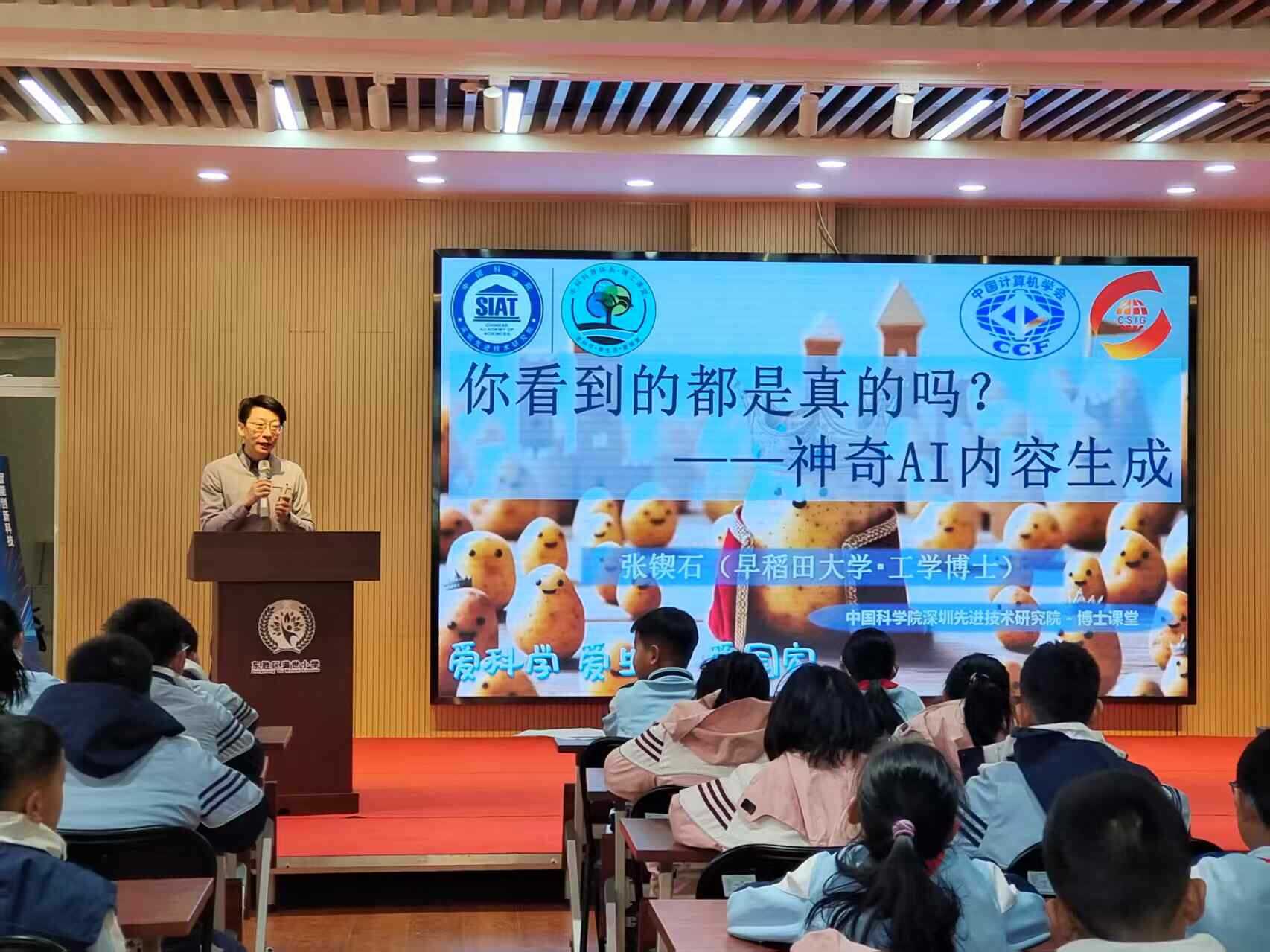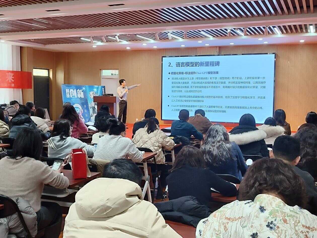 当天下午,东胜区教育教学研究中心在满世小学举办人工智能教育专题培训,张锲石为全体中小学信息科技教师带来“人工智能前沿进展之大模型”主题讲座。他重点介绍了大模型的内涵、特征、发展历程及未来趋势,通过生动的案例和详实的数据,为教师们提供了宝贵的教学资源和教学思路。
