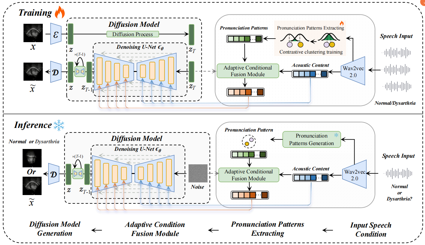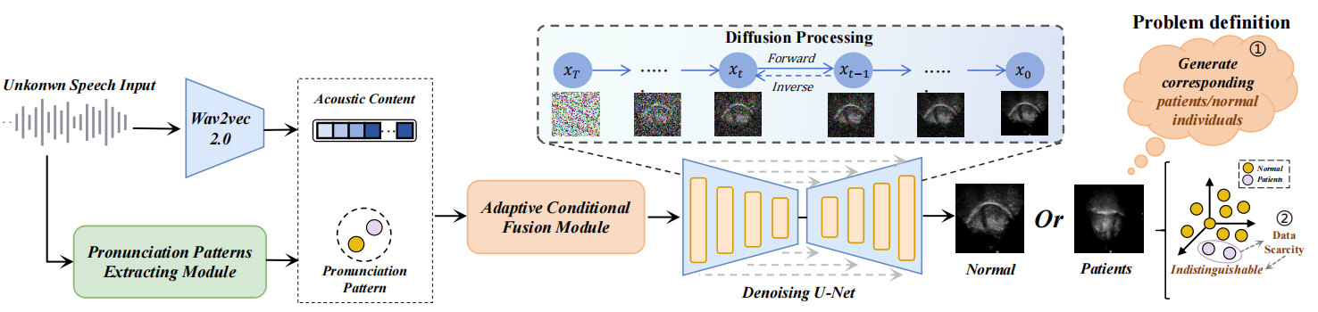 自适应生成:自适应条件融合模块能动态地将语音特征与识别出的发音模式相结合,确保生成的舌动图像既符合语音内容,又保留了特定发音模式(如病理性异常)的细节。