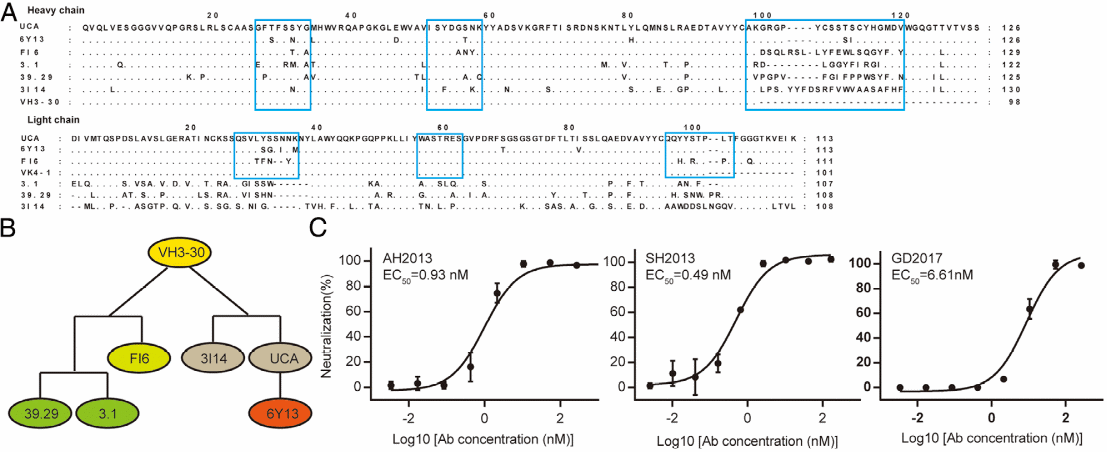 图1 人抗体6Y13的序列特征和广谱中和活性