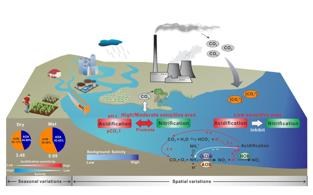 同时,研究进一步发现,长期富营养化状态下,珠江口水体酸化速率远高于开阔海域。在伶仃洋中游区域(即40公里的“源—汇”转换阈值处)形成了显著的“酸化–硝化”耦合热点。在该热点中,氨氧化微生物以铵盐为“燃料”进行硝化作用,每次反应都会释放出氢离子,削弱水体碱度并导致pH下降,形成局部“酸化中心”。该发现揭示了珠江口河口系统中存在一个自我强化反馈回路:富营养化驱动硝化作用,硝化引发酸化,而酸化环境又会筛选并塑造特定的微生物群落,反过来再次增强硝化过程。这一机制从微观层面揭示了大湾区水域固碳效率下降的根本原因,也为治理富营养化、提升区域碳汇潜力提供了新的科学思路。