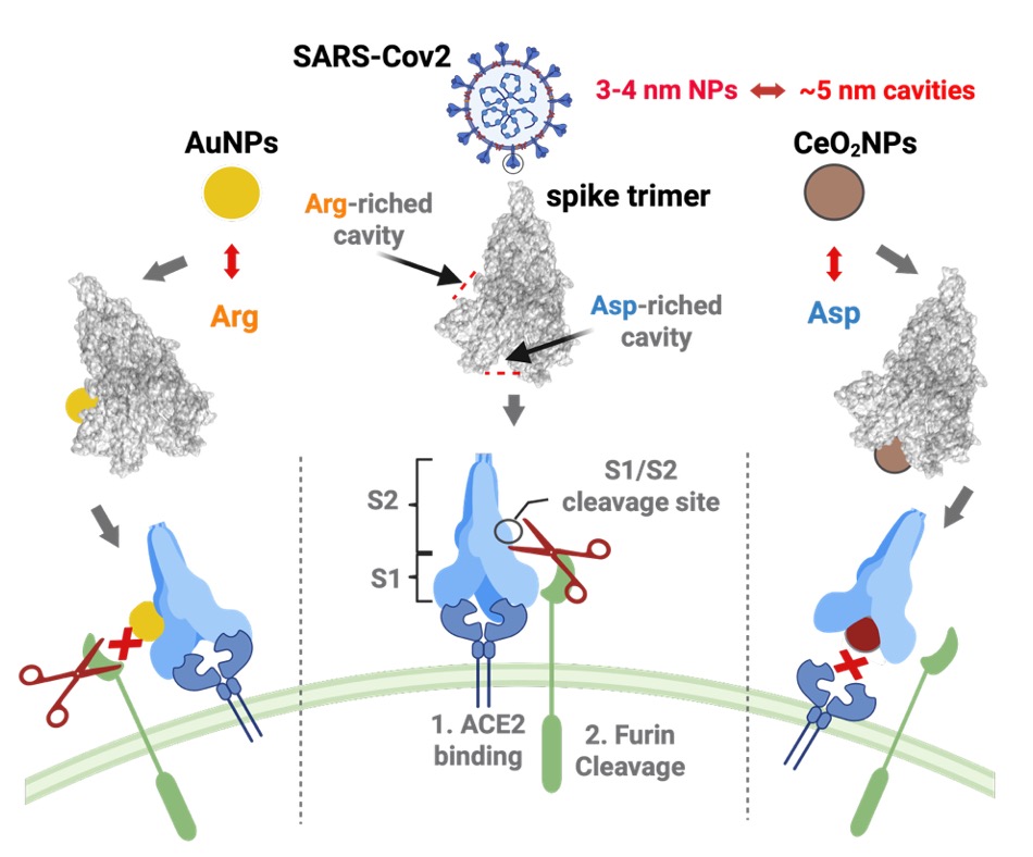 本研究以 SARS-CoV-2 刺突蛋白(Spike,S 蛋白)为模型体系,选取尺寸高度一致但表面化学性质不同的CeO₂NPs和金纳米颗粒(AuNPs),在严格控制尺寸变量的前提下,系统比较了纳米材料表面化学性质对蛋白腔体靶向行为的影响。结果显示,两类纳米颗粒均可通过与刺突蛋白结合发挥抗病毒作用,但其结合位点和分子机制存在显著差异。CeO₂NPs倾向于靶向富含天冬氨酸(Asp)残基的中央腔体,通过与 Asp 羧基之间的配位作用实现稳定结合,从而阻断S蛋白与宿主细胞ACE2受体的识别过程。而AuNPs主要结合富含精氨酸(Arg)残基的侧向腔体,依赖与Arg的静电作用和氢键相互作用,靠近S1/S2 酶切位点区域,干扰宿主蛋白酶介导的刺突蛋白激活过程。