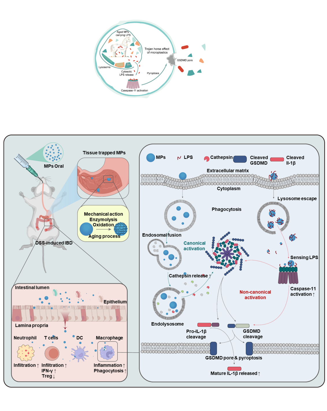 图1. 生物老化微塑料携带脂多糖进入巨噬细胞并放大炎症反应的“特洛伊木马效应”机制