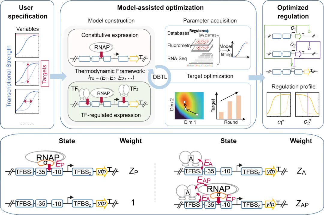 2. “白箱”机制指引理性设计:模型能够识别限制系统性能的“瓶颈”参数(如转录因子与聚合酶的协同作用能EAP或自发寡聚化反应平衡常数K1),为后续优化提供了明确的物理导向——既可直接指导理性设计,也能为“黑箱”模型或进化筛选提供明确的优化目标;