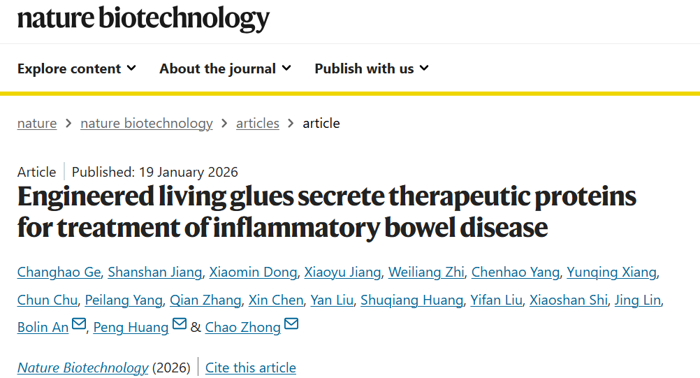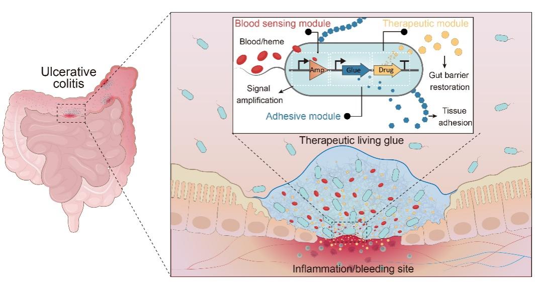 1月19日,中国科学院深圳先进技术研究院定量合成生物学全国重点实验室、合成生物学研究所钟超团队联合深圳大学医学部黄鹏教授团队在《自然-生物技术》发表研究,提出一种面向IBD的“智能活胶水”(Therapeutic Living Glue, TL-glue)。该体系以工程化肠道细菌为载体,能够感知肠道出血信号,在病灶处原位形成兼具黏附与治疗功能的生物胶基质,实现“感知—定位—治疗”一体化干预,为IBD精准治疗提供了新的合成生物工程思路。