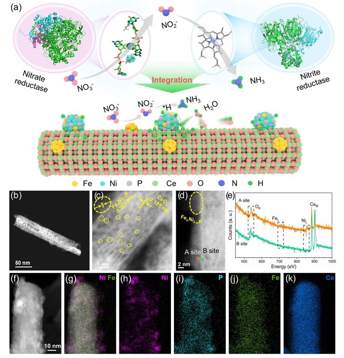 受自然界中反硝化细菌利用硝酸盐还原酶与亚硝酸盐还原酶协同高效转化硝酸盐为氨的启发,研究团队构建了Fe–FexNi2-xP/CeO2仿生纳米酶催化剂(图2a)。该催化剂通过两类活性位点的协同分工,模拟了上述酶催化过程:Fe团簇作为“硝酸盐还原酶”位点,凭借对氧物种的强结合力,优先催化硝酸盐脱氧生成亚硝酸盐(NO3⁻ → NO2⁻);邻近的FexNi2-xP纳米粒子则充当“亚硝酸盐还原酶”位点,利用其优异的加氢能力,将溢流而来的亚硝酸盐快速还原为氨(NO2⁻ → NH3)。此外,CeO2纳米棒载体不仅起到稳定双活性位点的作用,还可作为“质子池”调控局部反应微环境,有效抑制竞争性的析氢反应(HER),从而保障了反应的高效进行。球差校正电镜图像显示,超细的Fe团簇分布于FexNi2-xP 纳米粒子周围,两者间距小于1 nm,这种距离排布为中间体的溢流和接力催化提供了结构基础(图2b,c)。EELS谱学和元素映射结果进一步证实了该活性位点的结构特征(图2d-k)。