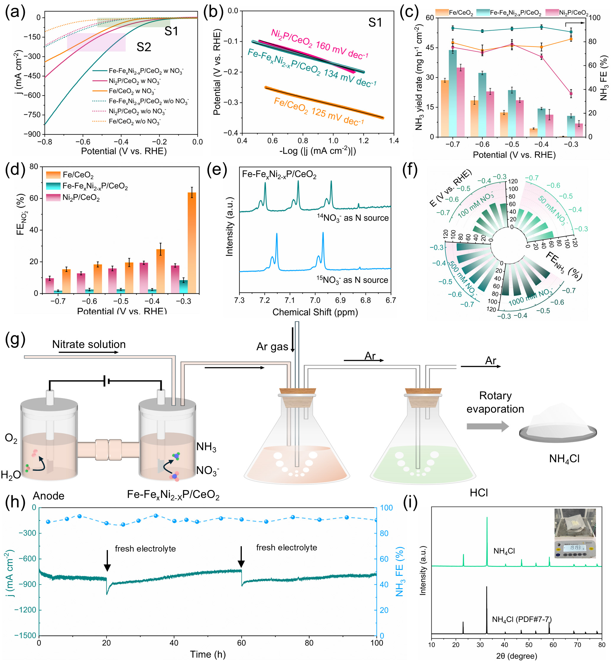 图3 Fe–FexNi2-xP/CeO2电催化硝酸根制氨的性能图