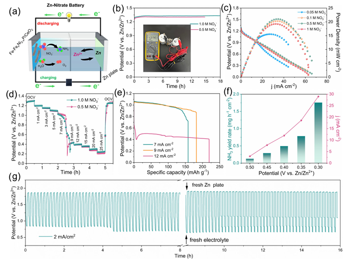 基于Fe–FexNi2-xP/CeO2催化剂在析氧和NO3RR方面的优异性能,研究团队进一步将其组装成可充电的锌-硝酸盐(Zn-NO₃⁻)电池(图5)。该电池在放电过程中不仅能输出21.1 mW cm-2的功率密度,还能在阴极同步实现氨的高效合成,产率达1.9 mg h−1 cm−1的高效转化,从而将“发电”与“合成氨”两种功能有机结合。在稳定性方面,该电池在更换锌片后仍表现出良好的循环充放电性能,显示出可靠的重复使用潜力。这一仿酶催化剂的集成设计,为实现分布式能源利用与含氮废水处理的耦合提供了一种具有前景的新方案。