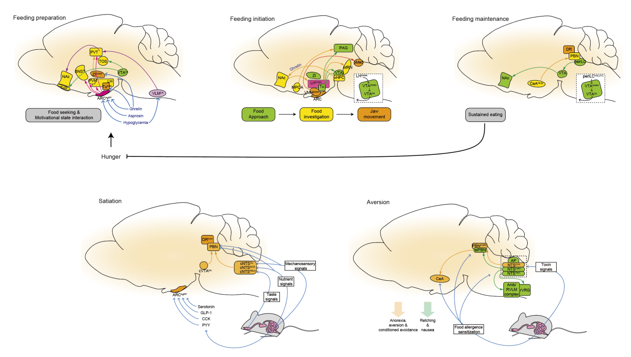 这篇综述的精彩之处在于它对这些行为阶段基于现有的大量文献进行了详实的神经映射。我们了解到,虽然下丘脑弓状核 AgRP 神经元可能会尖叫着“我饿了”(编码负面效价),它们必须将接力棒交给外侧下丘脑GABA能神经元来真正触发“靠近和探索”这一系列动作,随后再由中缝背核GABA能神经元和中央杏仁核五羟色胺受体2A神经元等来评价食物奖赏与应激的平衡从而维持这一行为。这种环路水平的行为分离可以解释一些非常有趣的行为,比如为什么动物可能会疯狂觅食却拒绝进食。
