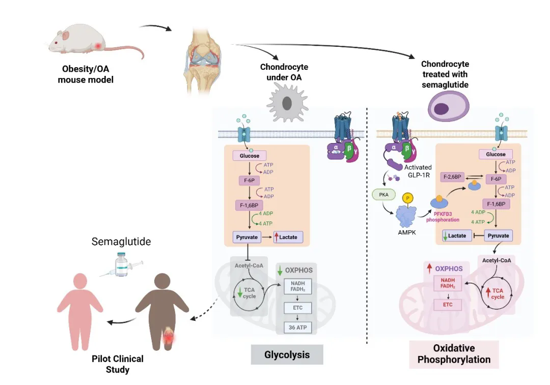 该研究首次揭示了司美格鲁肽能够重塑骨关节细胞中的糖代谢规律,从而改善骨关节炎的关键作用机制,为代谢性骨关节炎的临床治疗研究提供了潜在的药物开发新靶点。