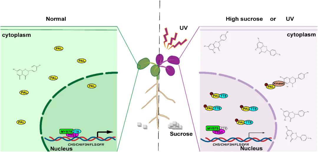 该机制形成了“代谢物诱导—PAL磷酸化—核转位—双重抑制”的负反馈环路,实现黄酮生物合成的精细调控。