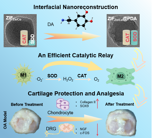 图1. 通过DA驱动预编程ZIFZn/Co框架的界面重构,实现SOD向CAT的高效催化接力。由此产生的纳米酶可打破骨关节炎中活性氧-炎症的恶性循环,从而实现显著的软骨保护和疼痛缓解效果。