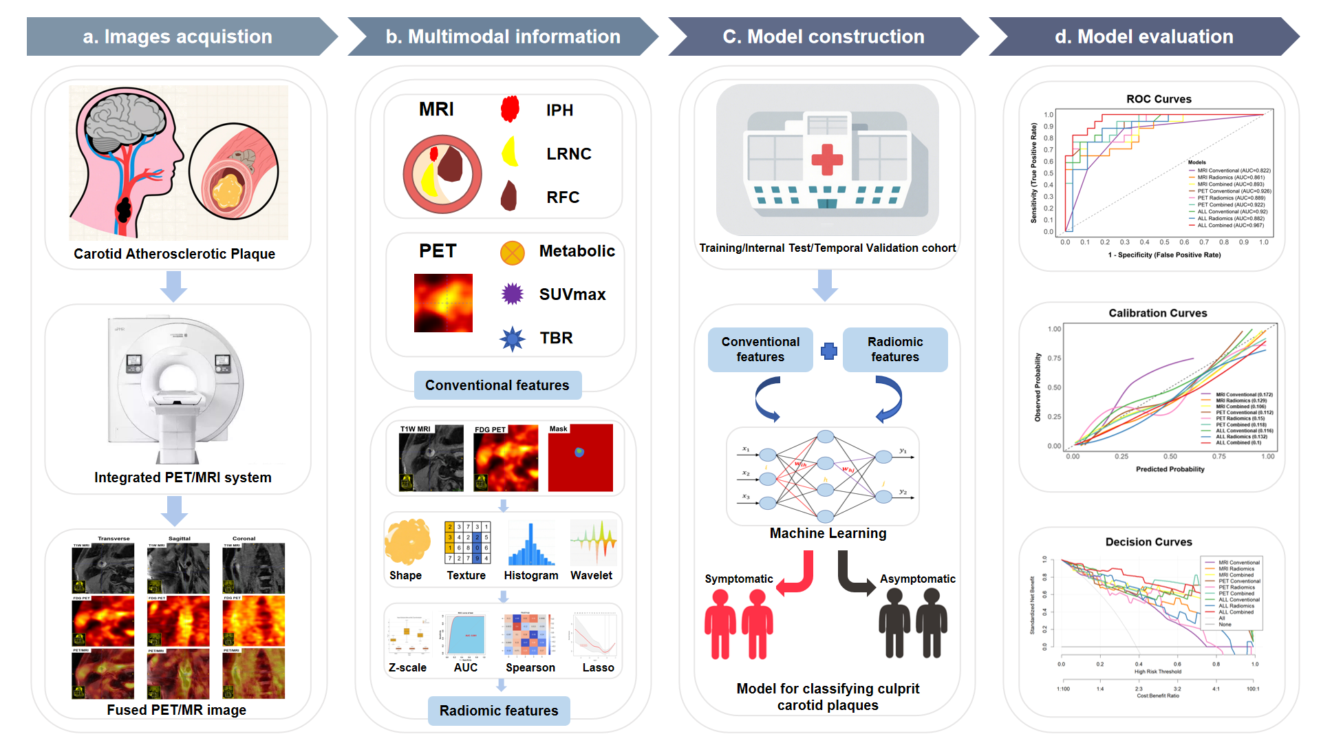 研究团队利用一体化PET/MRI系统的时空对齐优势,开发出多模态融合的智能评估模型。核心思路是突破传统单纯依赖单一解剖或代谢特征的瓶颈,通过从PET和MR-VWI中分别提取高维放射组学特征,并将它们与临床形态学指标(如斑块表面溃疡、强化)及代谢参数(如最大标准摄取值)相融合。这种全景式特征融合使模型能够更全面地解析斑块内部复杂的结构脆弱性与潜在炎症活跃度。为了解决模型临床适用性的问题,团队设计了严谨的验证策略。经过严格的时间独立验证队列测试(模拟未来未知临床数据),该一体化PET/MRI联合模型表现出优异的跨队列适应性与临床稳定性,显著优于仅依靠单一模态的预测模型。该方法为脑血管风险的无创精准评估与个体化干预提供了更高效、可靠的技术工具。