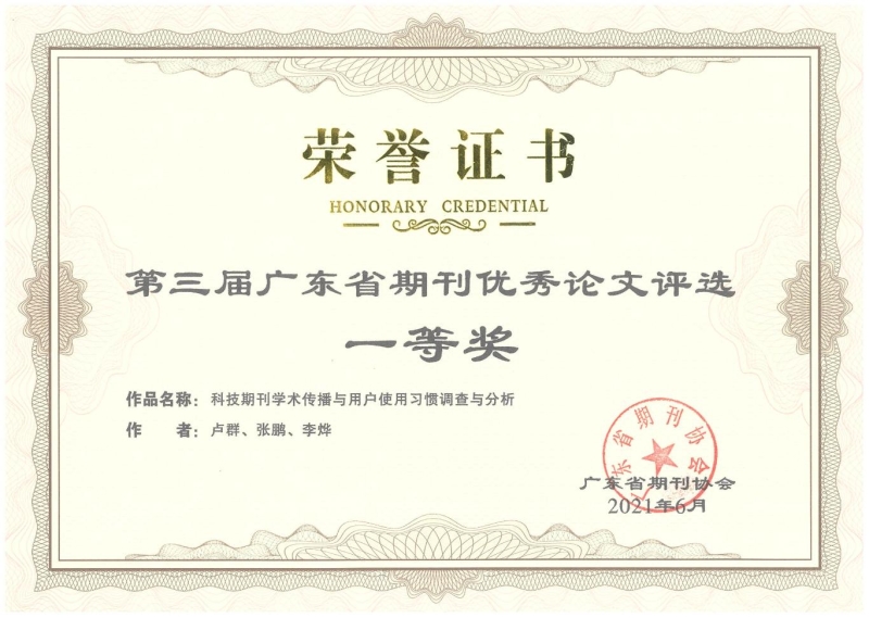 近日,由广东省期刊协会举办的“第三届广东省期刊优秀论文”评选结果揭晓,《集成技术》编辑部推荐参评的文章“卢群,张鹏,李烨. 科技期刊学术传播与用户使用习惯调查与分析[J].中国科技期刊研究,2020,31(5):556-562”获第三届广东省期刊优秀论文评选一等奖。