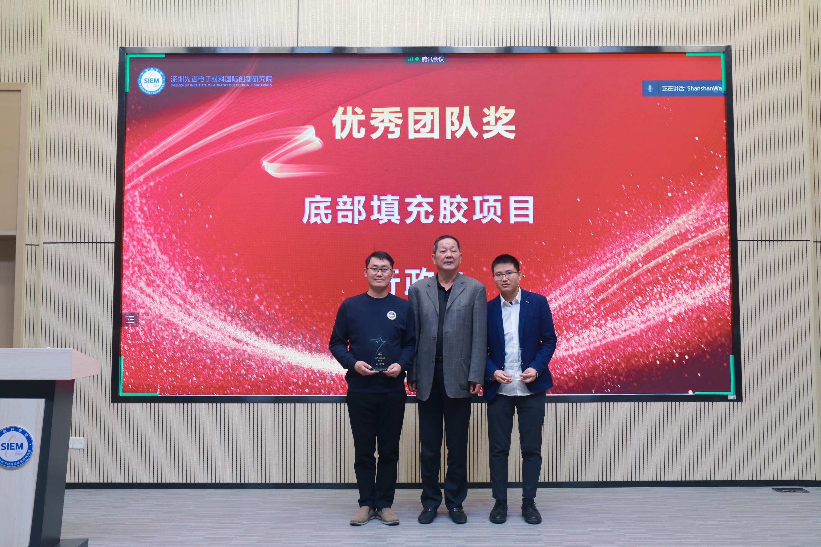 1月13日,中国科学院深圳先进院深圳先进电子材料国际创新研究院以线上线下相结合的方式召开2021年度总结表彰大会,对获得电子材料院2021年度院长创新奖、十年耕耘奖、优秀团队、优秀员工、优秀工程师等荣誉的部门和个人进行表彰。深圳先进院副院长许建国、电子材料院院长孙蓉、各部门负责人、先进集体代表和优秀个人代表等参加大会,大会由电子材料院副院长张国平主持。