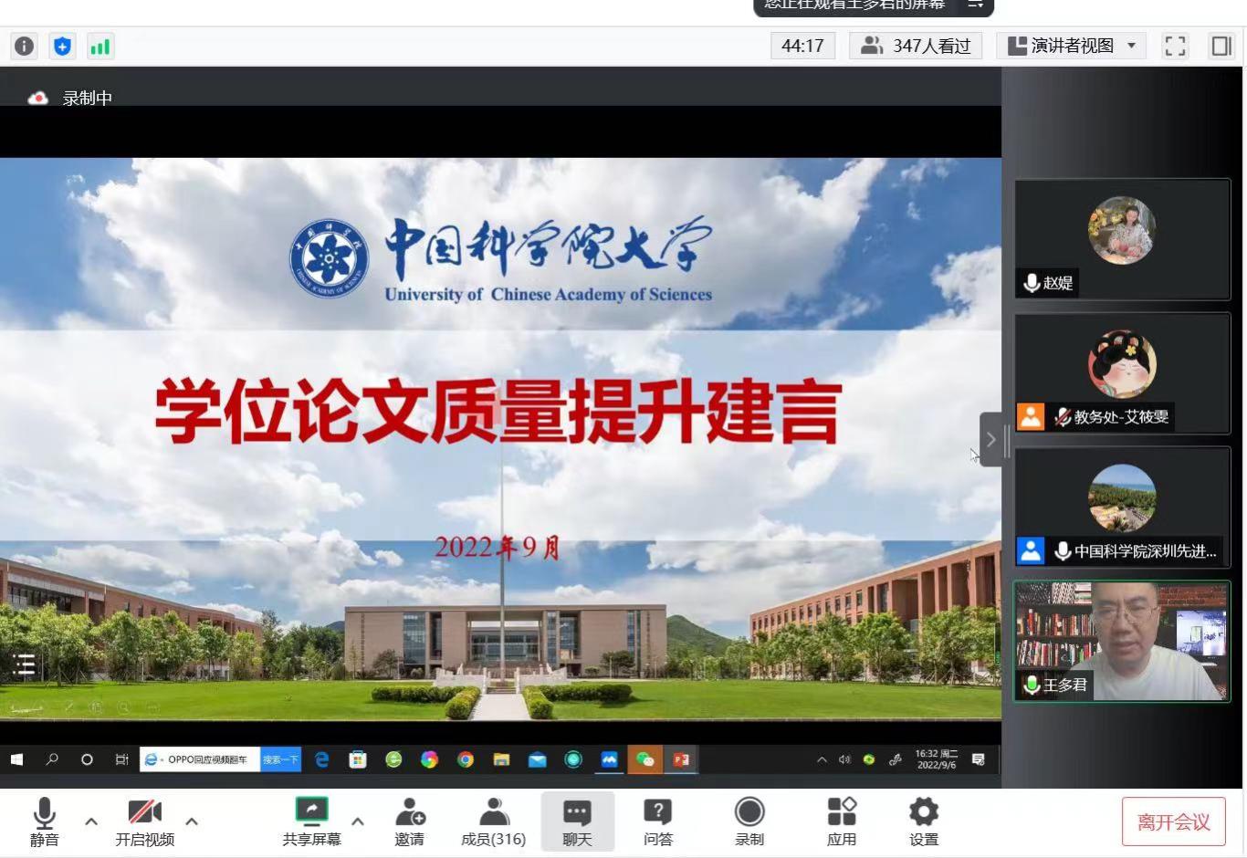 为进一步加强研究生学术规范和学术道德教育,提升毕业生学位论文写作质量,规范写作标准,9月6日下午,中国科学院深圳先进技术研究院通过线上线下相结合方式开展了研究生学位论文质量提升培训会。本次会议由深圳先进院教育处、教学事务处处长杨帆主持,特别邀请了中国科学院大学培养与学位部部长王多君教授和图情情报与档案管理系主任初景利教授进行指导,2023届毕业生参加了本次培训。