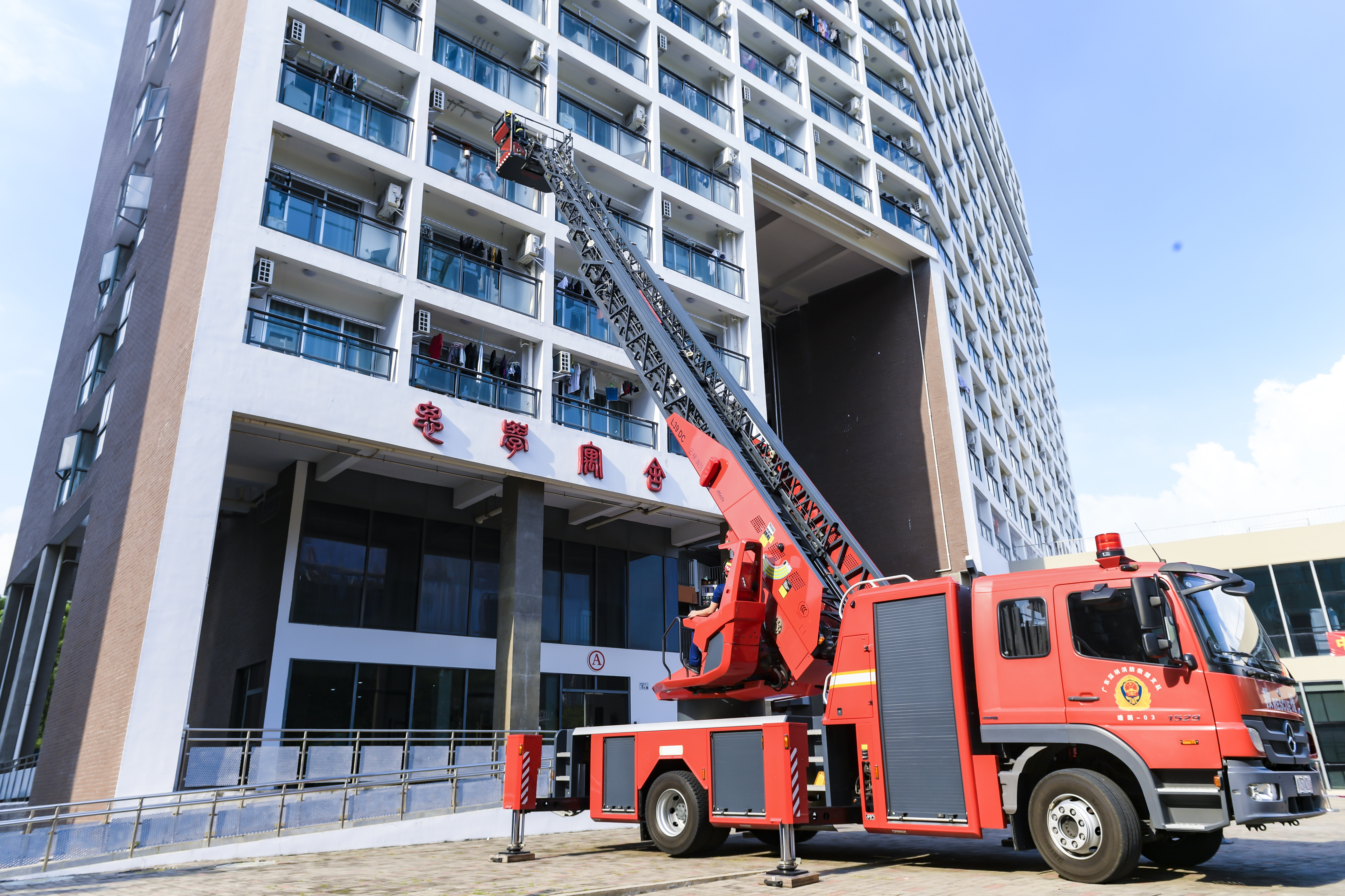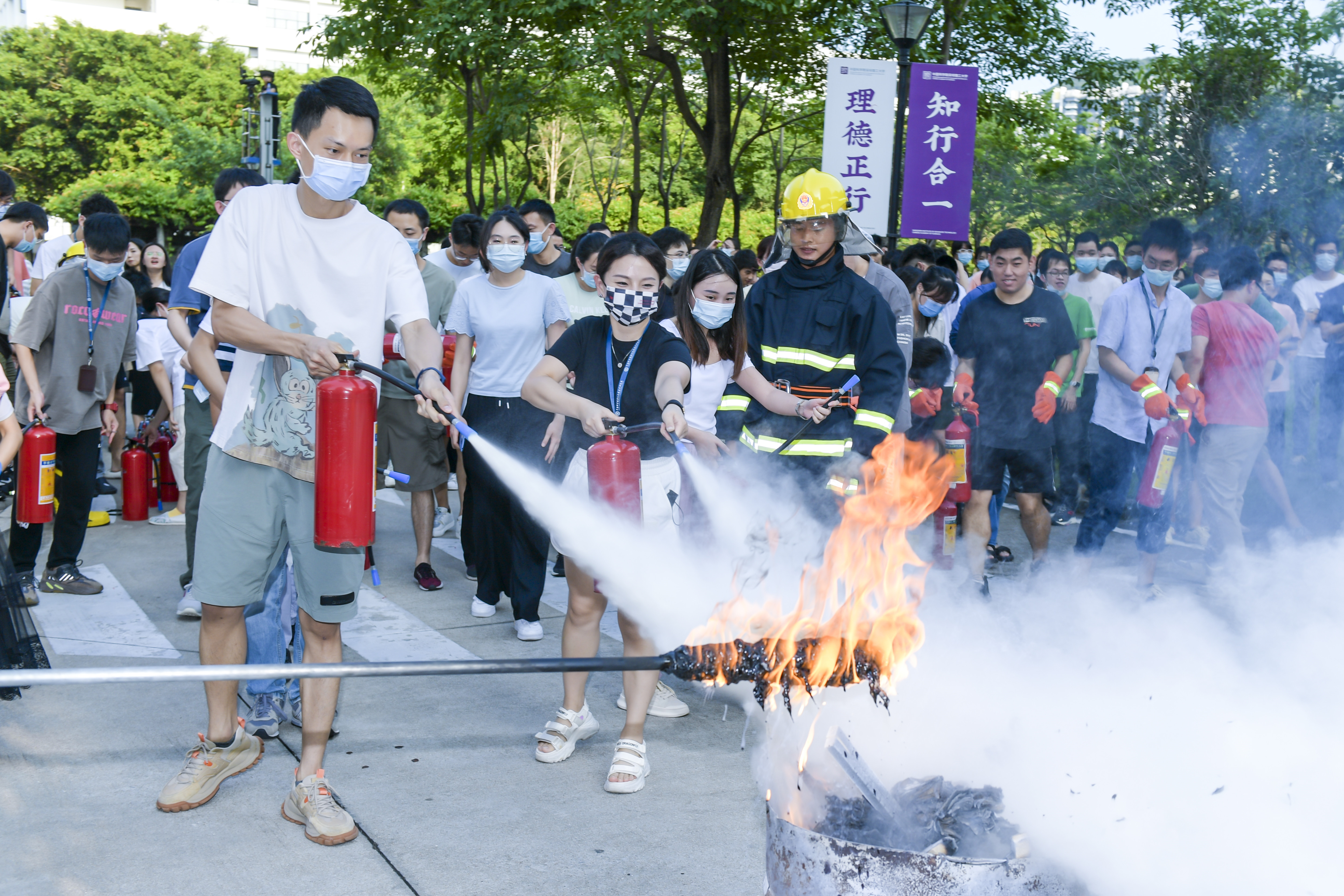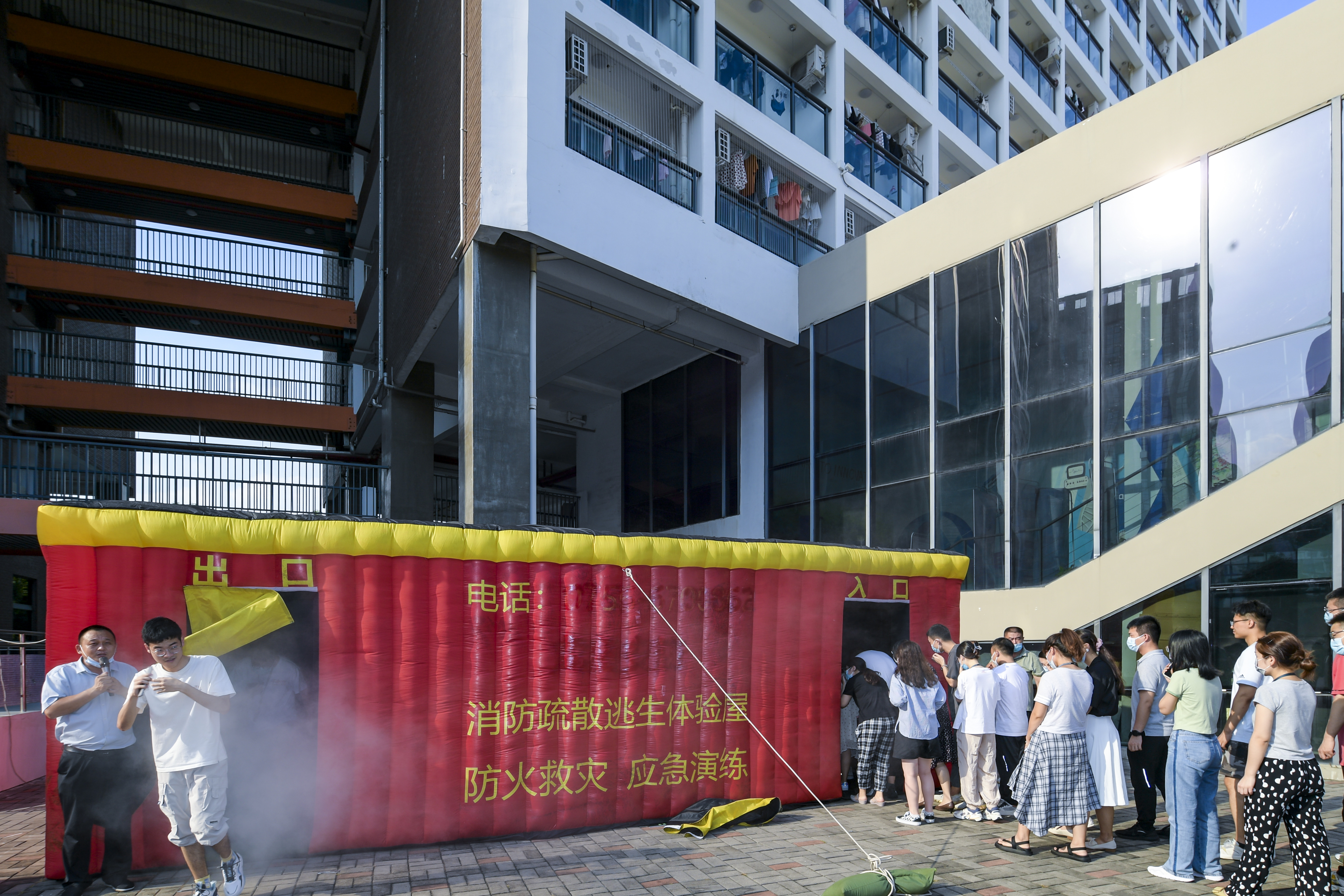下午16时30分,消防警报突然鸣响,广播通知园区某楼栋出现火情,所有人员按应急预案的疏散线路进行了紧急安全撤离,到达指定的安全区域集中。安全检查组迅速检查各栋建筑物各楼层人员撤离情况,同时,各团队安全员清点人数,以确保所有人员撤离。随后,深圳市南山区消防救援大队塘朗消防救援站的战士使用云梯车营救出两名被困学生。现场医疗救护组对陷入昏迷、呼吸微弱的同学进行心肺复苏抢救讲解。塘朗消防救援站的战士进行了灭火器使用培训及现场指导,现场人员参加了使用灭火器扑灭火灾以及火灾逃生屋的模拟演练。